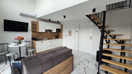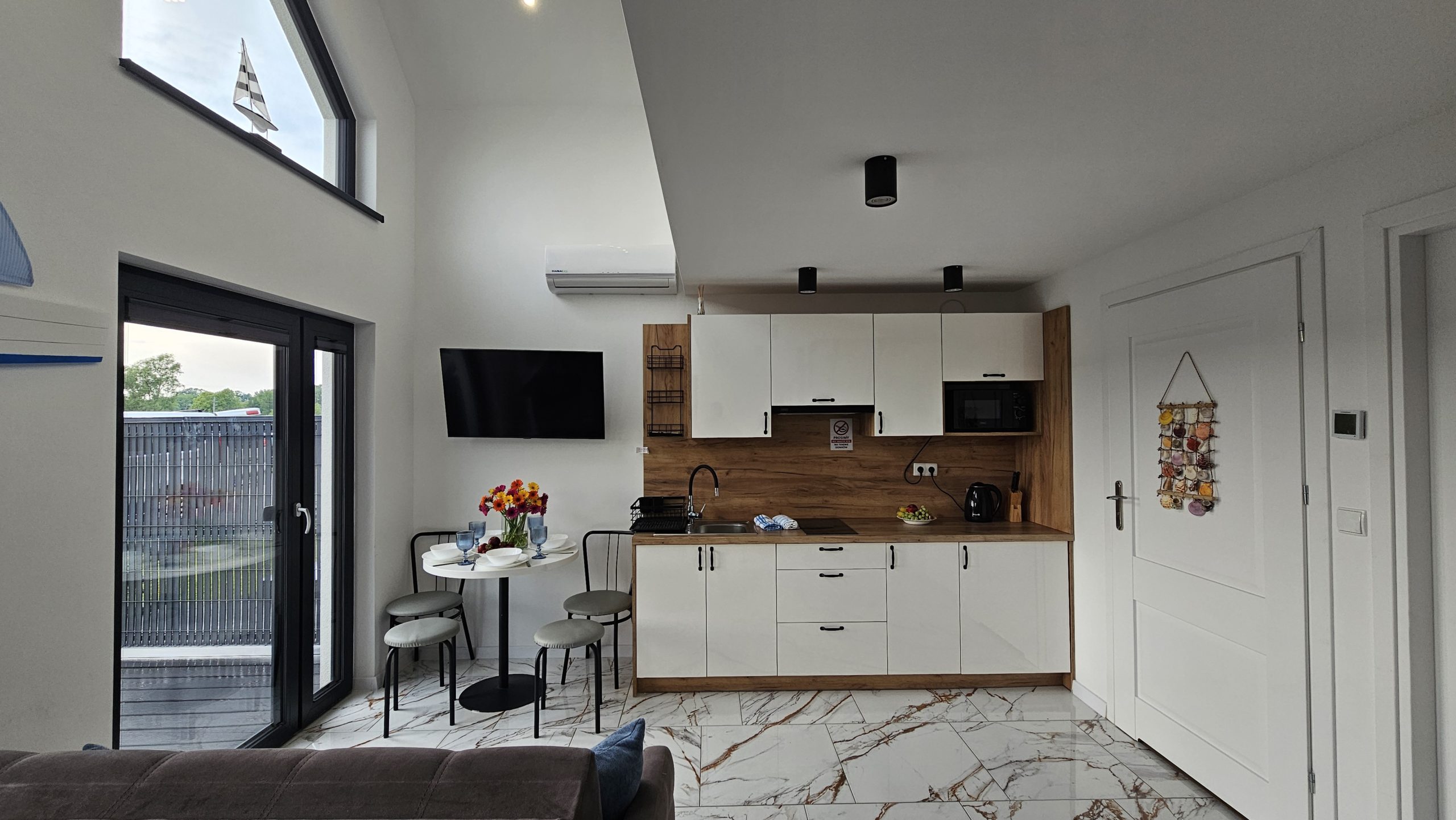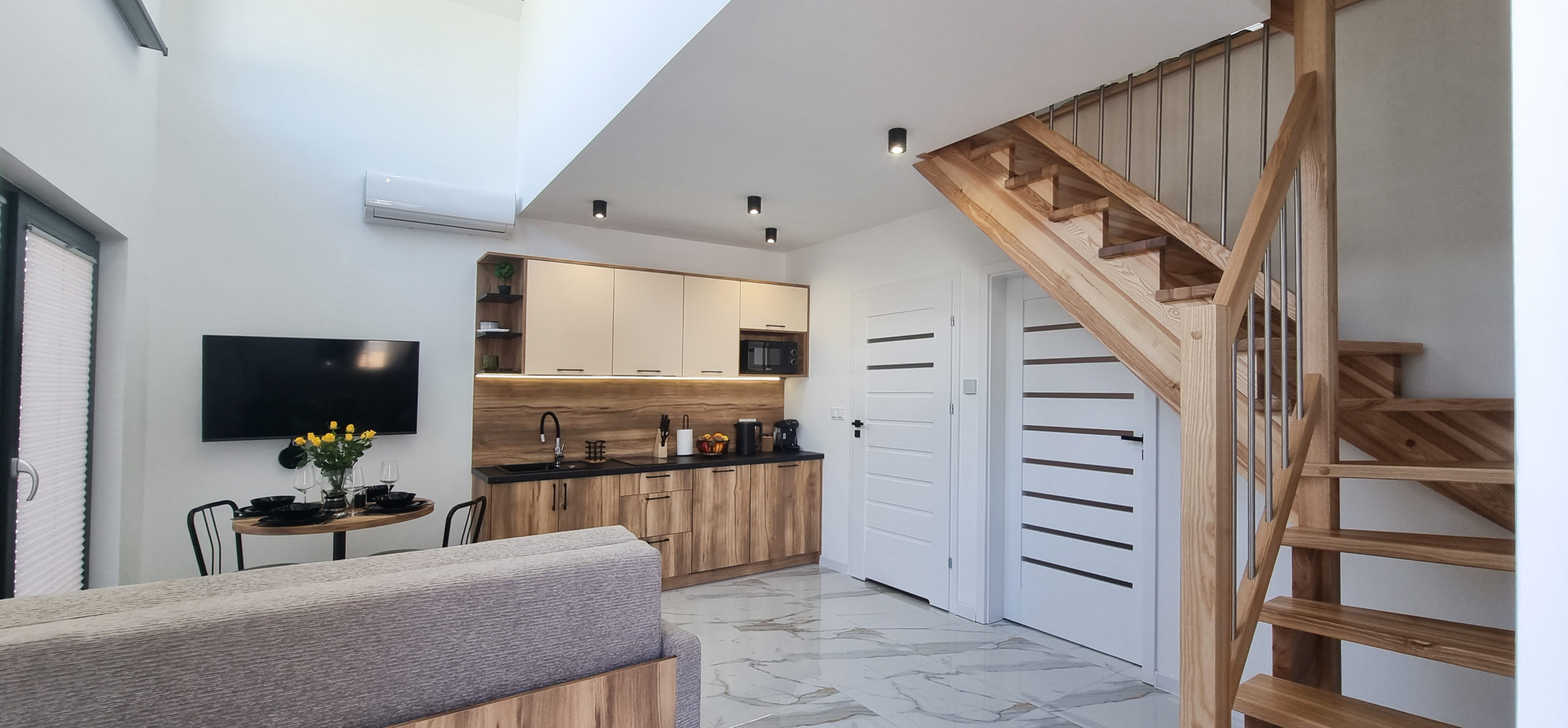 – Montaż podgrzewacza wody o pojemności 80L, zapewniający ciepłą wodę w łazience i kuchni