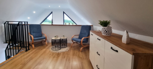 – Ocieplenie budynku wełną mineralną o niskim współczynniku przenikania ciepła (grubość ściany konstrukcja+izolacja 30cm, na podłodze wylewka 10cm) wraz z położeniem tynku akrylowego (kolor wybierany jest przez Państwa)