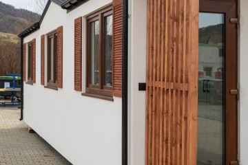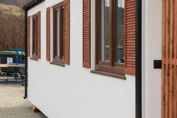Domek skonstruowany jest z drewna szkieletowego typy c24. Na zewnątrz ocieplony rewelacyjną płytą firmy Steico, wewnątrz ocieplony pianą PUR. Zewnętrzna elewacja wykończona tynkiem silikatowo-silikonowym. W domku zamontowane zostały okna 3-szybowe. Pokrycie dachowe wykonane jest z blachy pospolicie nazywanej „na rąbek” firmy Blachotrapez.