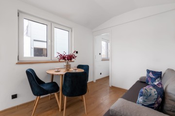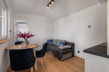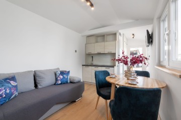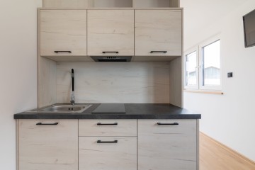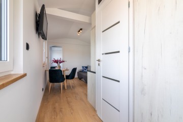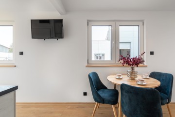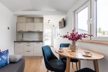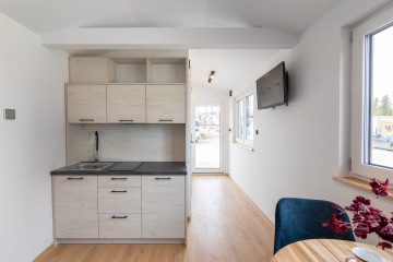 - Aneks kuchenny narożny, zawierający lodówkę, płytę indukcyjną dwupalnikową, okap podszafkowy, zlewozmywak z baterią