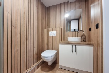 Łazienka wyposażona jest w umywalkę z baterią, szafką i lustrem, WC, prysznic oraz termę firmy Ariston. W łazience wbudowana jest także pompa do odprowadzania nieczystości.