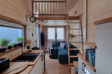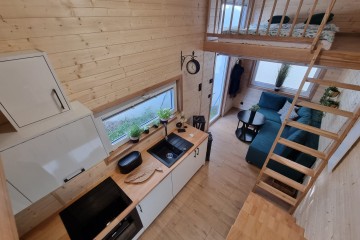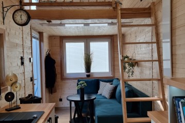 Wewnątrz zaprojektowano pokój dzienny połączony z aneksem kuchennym, łazienkę oraz 2 antresole o wymiarach 2,3 m x 2,5 m. Na antresole prowadzą schody oraz drabinka.